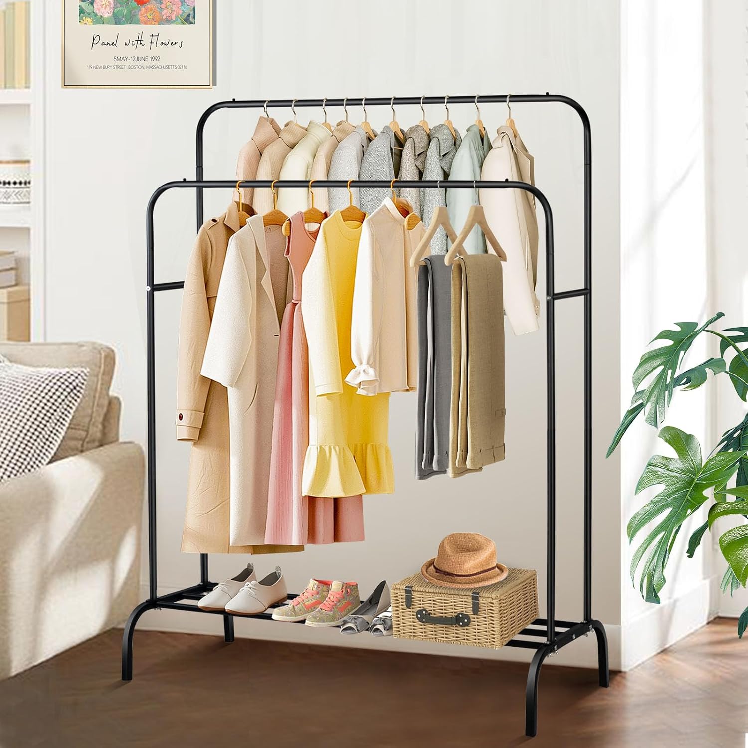 - Perfect Dimension:High pole: 150x110x50cm (length * width * height), low pole: 125x110x50cm, double pole design can accommodate double the number of clothes, can be placed in high according to the length of the clothes Or on the low bar to meet your life needs. The side rails can also hold silk scarves, etc., and the double bottom shelf can also hold multiple pairs of shoes, boxes, and other small items
