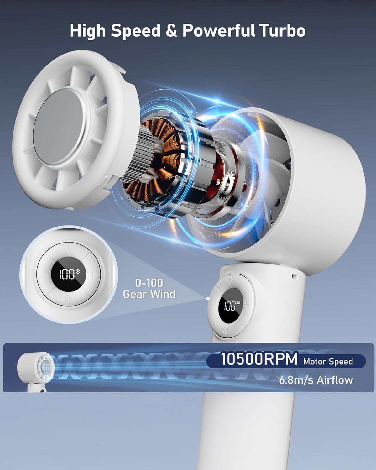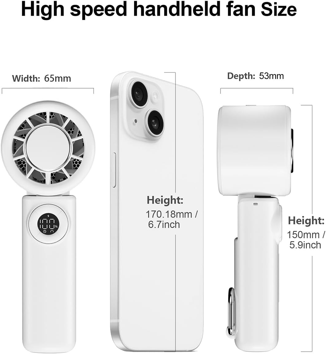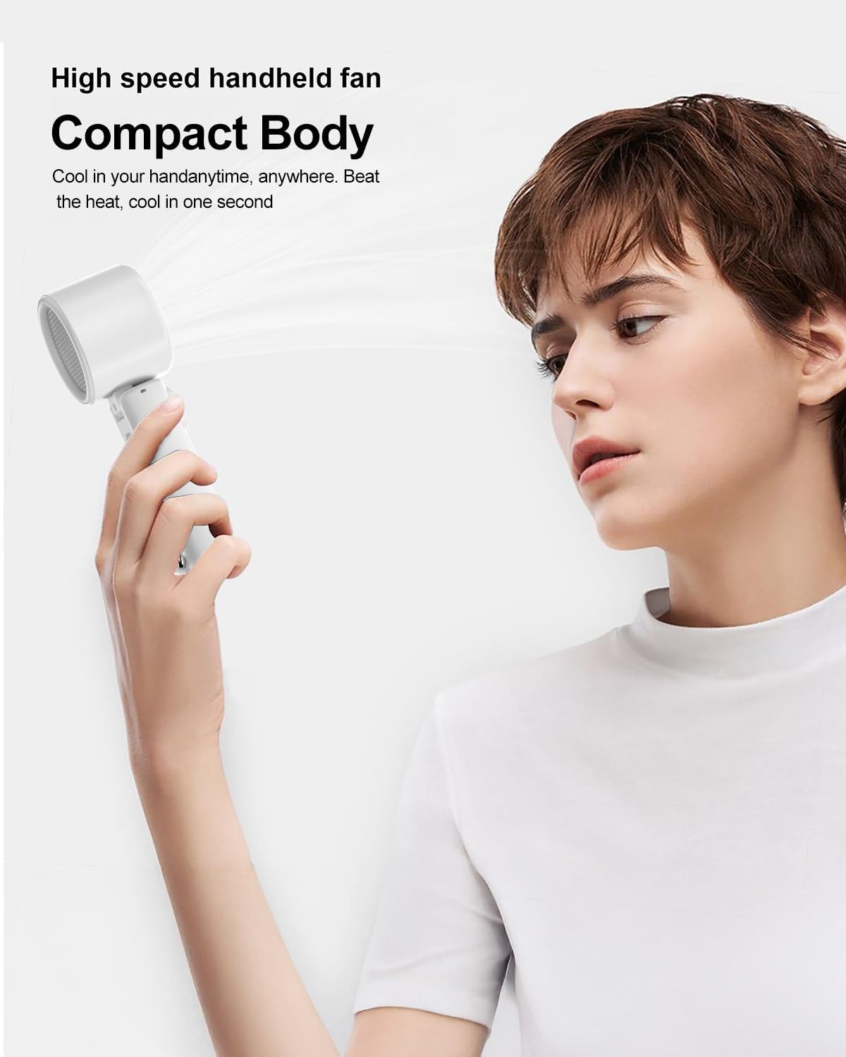- 𝐏𝐨𝐰𝐞𝐫𝐟𝐮𝐥 𝐁𝐫𝐮𝐬𝐡𝐥𝐞𝐬𝐬 𝐌𝐨𝐭𝐨𝐫 – The portable fan built in a high speed brushless motor, the highest motor speed up of the handheld fan is to 12000RPM, makes the hand fan provides a more powerful airflow, the maximum wind speed can reach 9m/s.