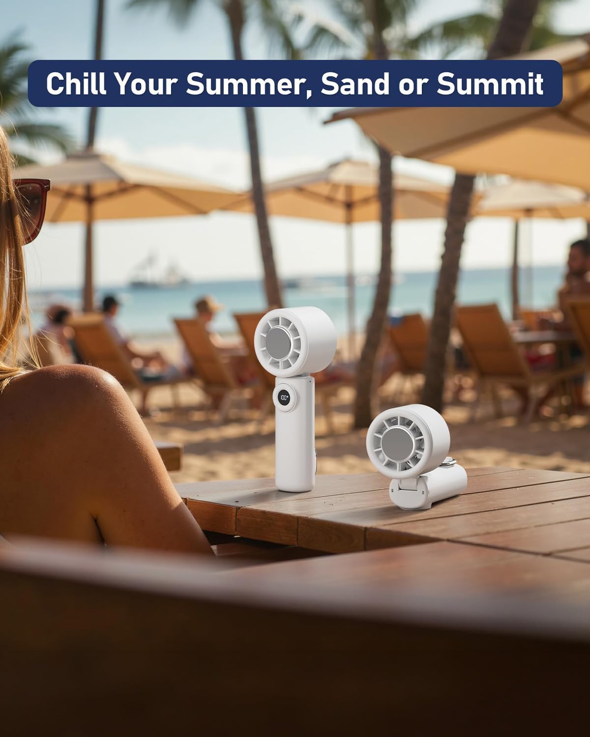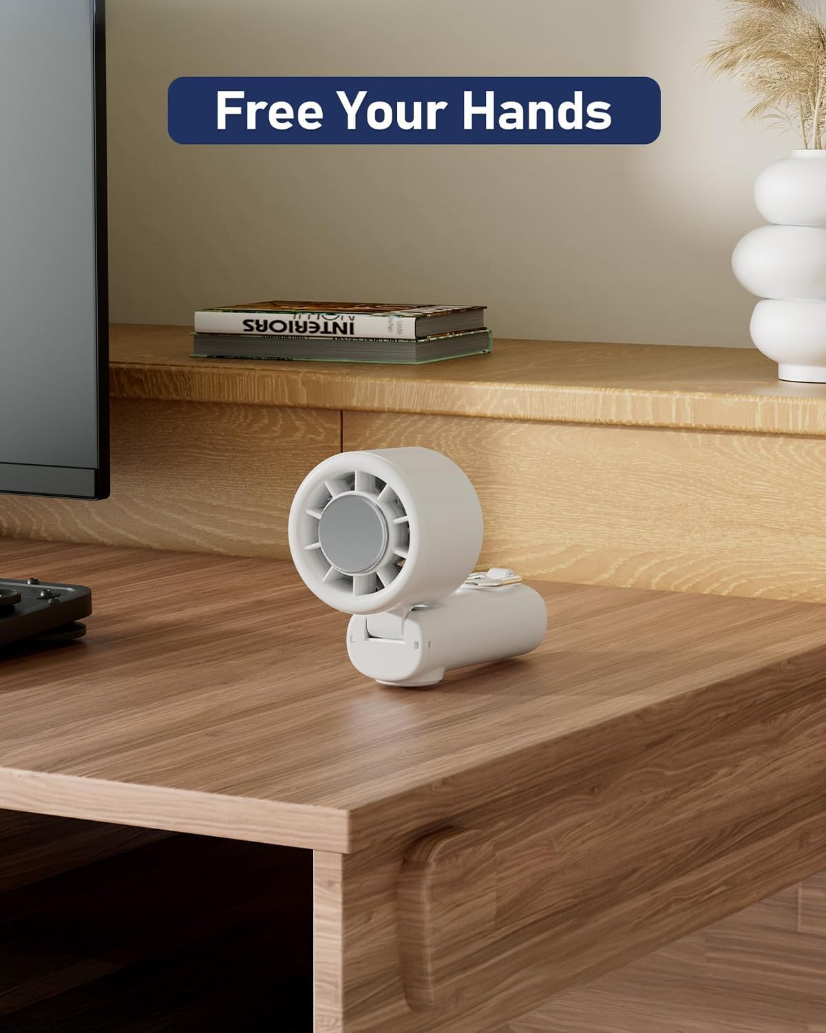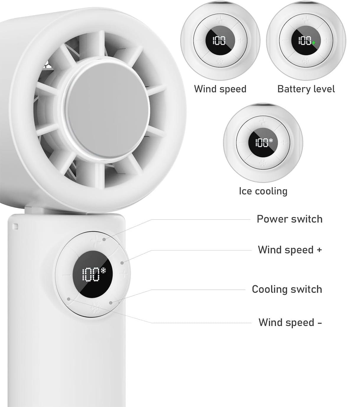 - 𝐏𝐨𝐰𝐞𝐫𝐟𝐮𝐥 𝐁𝐫𝐮𝐬𝐡𝐥𝐞𝐬𝐬 𝐌𝐨𝐭𝐨𝐫 – The portable fan built in a high speed brushless motor, the highest motor speed up of the handheld fan is to 12000RPM, makes the hand fan provides a more powerful airflow, the maximum wind speed can reach 9m/s.