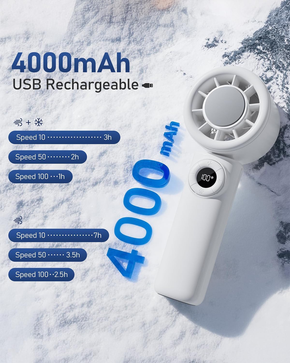 - 𝟒𝟎𝟎𝟎𝐦𝐀𝐡 𝐑𝐞𝐜𝐡𝐚𝐫𝐠𝐞𝐚𝐛𝐥𝐞 𝐁𝐚𝐭𝐭𝐞𝐫𝐲 – The rechargeable portable fan equips with a large battery, provides a super long working time. The more larger capacity of battery, the more endurance the handheld fan provides. The energy storage of the portable fan is capable of meeting your whole day cooling needs.