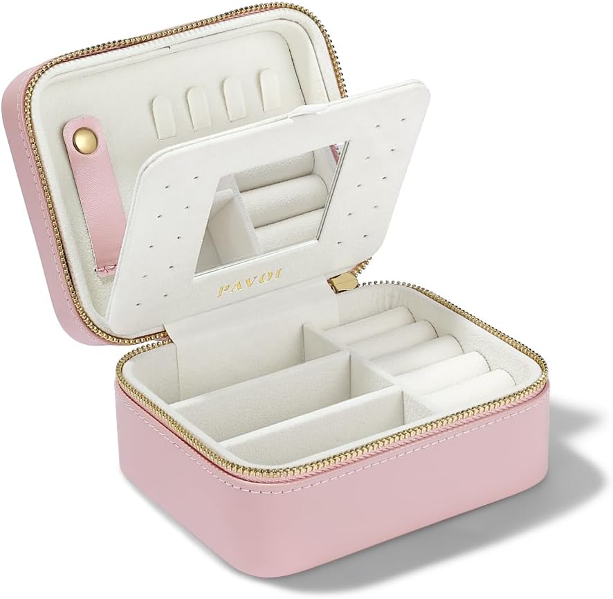 - Made with premium faux leather PU, this jewelry travel case for women feels as luxurious as it looks, with 0.8mm thickness for a sturdy yet stylish finish. The soft interior is gentle on delicate pieces, and the built-in mirror adds extra convenience. Perfect as a gift or a personal treat, this mini travel jewelry organizer ensuring your gold necklaces, earrings, rings and bracelets safe, organized and always travel-ready.